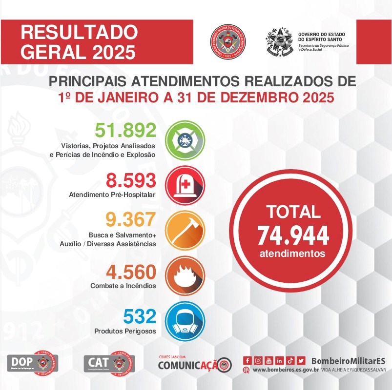 Em 2025, o Corpo de Bombeiros Militar do Estado do Espírito Santo (CBMES) reafirmou seu compromisso com a proteção da vida, do patrimônio e do meio ambiente ao registrar um total de 74.944 atendimentos realizados entre 1º de janeiro e 31 de dezembro. Os números demonstram a amplitude e a relevância da atuação da corporação em todo o território capixaba. Ao longo do ano, foram realizadas 51.892 vistorias, análises de projetos e perícias de incêndio e explosão, evidenciando a forte atuação preventiva e técnica da instituição na promoção da segurança contra incêndio e pânico. Na área operacional, o CBMES efetuou 8.593 atendimentos pré-hospitalares, garantindo suporte emergencial à população em momentos críticos, além de 9.367 ocorrências de busca e salvamento e diversas assistências, abrangendo desde resgates em altura e em locais de difícil acesso até salvamentos aquáticos e atendimentos diversos. Também foram registrados 4.560 combates a incêndios, tanto em áreas urbanas quanto rurais e ambientais, e 532 atendimentos envolvendo produtos perigosos, demonstrando a capacidade técnica especializada da corporação para lidar com ocorrências de alta complexidade e risco.