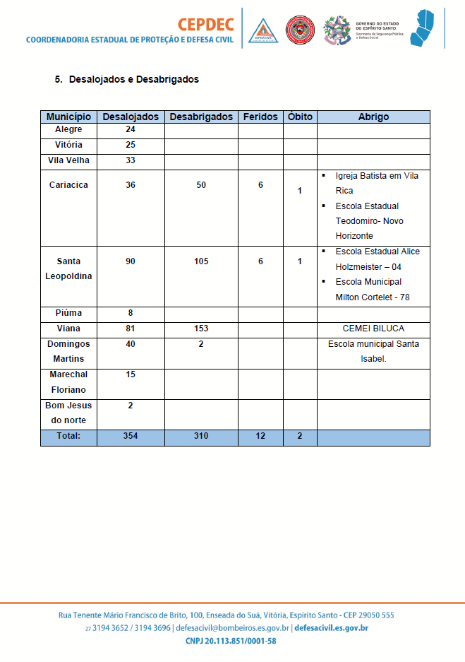 ➡ Desalojados: 354 pessoas